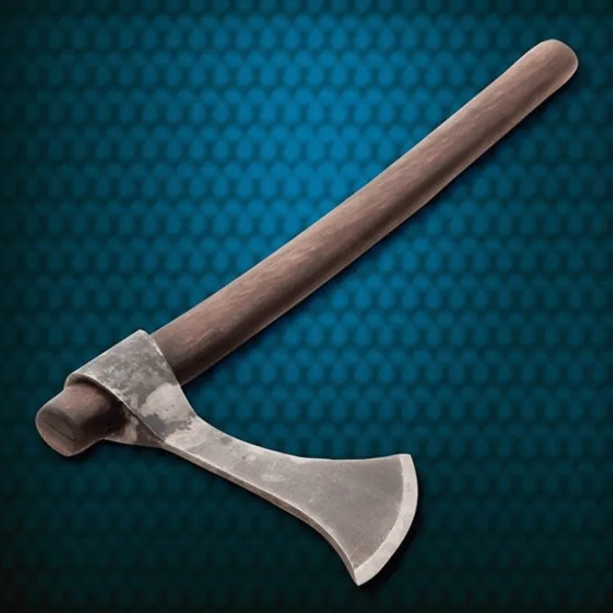 En fremragende germansk kaste økse af Ankerspil Steelcraft til udendørs og indendørs øksekast. De germanske og frankiske folk brugte akser som denne i kamp for nærkamp og som en dødelig kaste økse. Dette kaster øksen har en axehead med hånd smedet finish og en mørk træ skaft med en svag krumning for ekstra effekt. En smuk dekorativt økse til væggen, også perfekt til tidlig middelalder reenactment og Last Kongerige og vikinger cosplay. Great for øksekast!