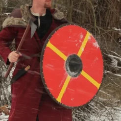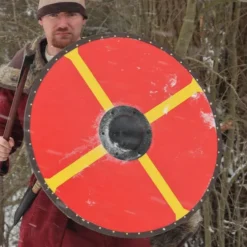 En stærk Viking skjold lavet af træ, perfekt til Viking reenactment, vikingerne Cosplay og Viking kostumer. Dette skjold har en sværtet stål skjold boss og et træskaft på bagsiden til at holde skjoldet fast i reenactment slag. Kanterne af skjoldet er dækket med læder og dekoreret med nitter. Skærmen er malet i rød og gul.